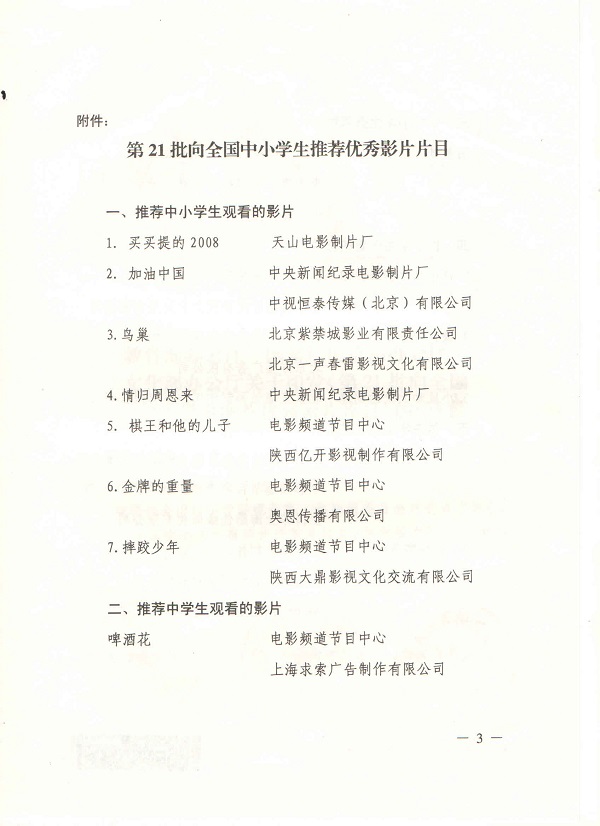 向全国中小学生推荐优秀影片片目