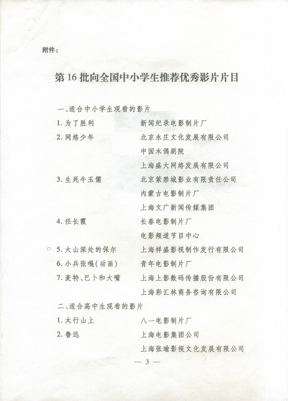 向全国中小学生推荐优秀影片片目