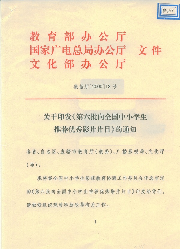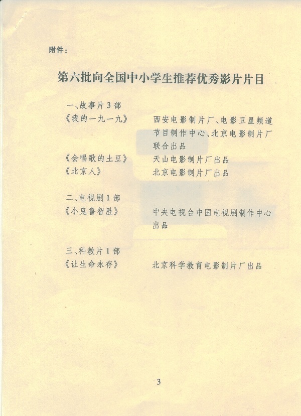 全国中小学生影视教育协调工作委员会向全国中小学生推荐优秀影片片目第六批(2000) 一、故事片:《我的一九一九》出品单位:西安电影制片厂 电影卫星频道节目制作中心 北京电影制片厂《会唱歌的土豆》出品单位:天山电影制片厂《北京人》出品单位:北京电影制片厂二、电视剧:《小鬼鲁智胜》出品单位:中央电视台中国电视剧制作中心三、科教片:《让生命永存》出品单位:北京科学教育电影制片厂 分享至: